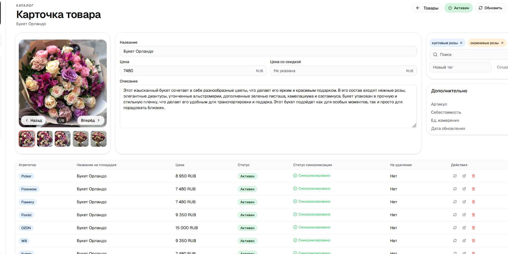 Единое управление букетами, товарами и видимостью во всех ключевых каналах.